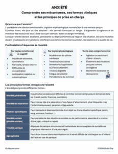 Le document sur le tableau des colonnes de Beck comporte 4 pages, incluant des exemples concrets et des trames vierges à remplir. Dans le tableau des colonnes de Beck, chaque colonne représente une étape dans l’analyse d’une situation stressante : la situation, les émotions ressenties, les pensées automatiques, les pensées plus rationnelles, et enfin, l’impact sur les émotions après la réévaluation. Cela permet aux individus de comprendre comment leurs pensées influencent leurs émotions et leurs comportements. Ce travail constitue à la fois une prise de conscience de ses schémas de pensée et une restructuration cognitive, dont l’objectif est de remettre en question ses pensées excessivement négatives afin d’en observer l’impact sur les émotions ressenties (et ultérieurement sur les comportements).