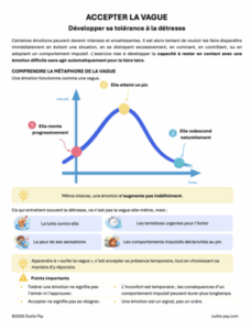 Cet outil se compose de deux pages complémentaires. La première page propose une psychoéducation sur la métaphore de la vague : schéma illustrant la montée, le pic et la descente de l’émotion, explication des facteurs qui entretiennent la détresse (lutte, peur des sensations, évitement urgent, comportements impulsifs) et points clés pour distinguer acceptation et résignation. La seconde page est un exercice guidé en cinq étapes : identifier l’émotion, observer sans juger, rester avec la vague pendant quelques minutes, observer son évolution, puis choisir une réponse alignée avec ses valeurs plutôt qu’une réaction impulsive.