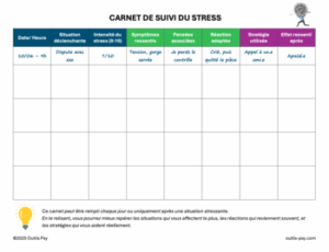 Le carnet de suivi du stress est un document d’une page, conçu comme un tableau simple et structuré pour accompagner l’observation et l’analyse des épisodes de stress. La personne y renseigne, après chaque situation vécue : la date et l’heure, la situation déclenchante, l’intensité du stress (sur une échelle de 0 à 10), les symptômes ressentis, les pensées associées, la réaction adoptée, la stratégie utilisée et l’effet ressenti après coup.