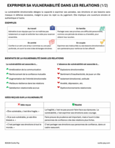 Ce document en deux pages propose à la fois une partie psychoéducative (définition de la vulnérabilité, ses bénéfices et les fausses idées qui y sont associées) et une partie réflexive (identifier ses blocages, reconnaître ses freins, réfléchir à ses contextes de confiance et rappel sur la communication non violente).