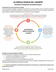 Cette fiche d’une page propose une présentation accessible de 12 manifestations physiologiques associées à la réaction de combat-fuite. Elle permet aux enfants d’identifier les réactions corporelles qu’ils peuvent ressentir dans des situations effrayantes ou stressantes, tout en constituant un support de discussion. L’objectif est d’explorer ensemble les sensations vécues par l’enfant, leur intensité et, si pertinent, les pensées qui y sont associées. Cette discussion peut également être l’occasion d’aborder les stratégies de gestion mises en place par l’enfant pour faire face à ces situations.