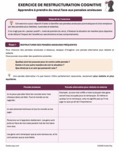 Cet exercice de restructuration cognitive des pensées anxieuses est structuré en deux parties. La première partie propose plusieurs exemples de pensées anxieuses fréquentes ; l’objectif est d’identifier, pour chacune d’elles, une pensée alternative plus réaliste et aidante (un exemple est fourni à titre illustratif). La seconde partie invite la personne à appliquer cette démarche à sa propre expérience, en identifiant trois pensées anxieuses issues de son quotidien et en formulant, pour chacune, une pensée alternative plus équilibrée.